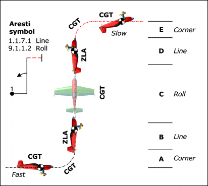 For every 5° of yaw, pitch or roll by which the aircraft CGT (Center of Gravity Track) or ZLA (Zero Lift Axis) differs from what is required when starting, at all ‘key’ points and at the exit from each figure, you should deduct one point. A cumulative error in any figure of more than 45° must by definition result in a mark of 0.0